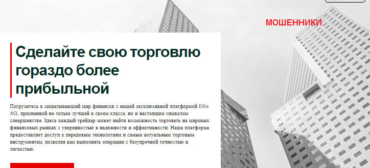 Ellis AG — это очередной псевдоброкер, который маскируется под международную инвестиционную платформу, обещая клиентам быстрый заработок и надежные финансовые услуги. За громкими лозунгами и красивым дизайном сайта скрывается