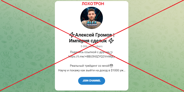 В мессенджере Телеграмм очень много блогов, которые ведутся от имени успешных биржевых трейдеров. Однако их общим недостатком является присущая Всемирной Паутине возможность называть себя здесь кем угодно. Если не проверить личность потенциального партнера и доверить ему свой капитал, то финансовые потери почти неизбежны. Как действуют такие скамеры, можно рассмотреть на примере канала ⚡️Алексей Громов | Империя сделок ⚡️