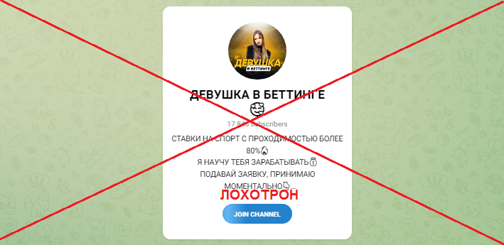Любое сотрудничество с Телеграмм-каналом ДЕВУШКА В БЕТТИНГЕ запрещено. Ведущая, скорее всего, является нанятой актрисой, а самой площадкой управляют скамеры. Клиенты заманиваются обещаниями выдачи проходных сигналов, но на практике они получают бесполезную информацию.